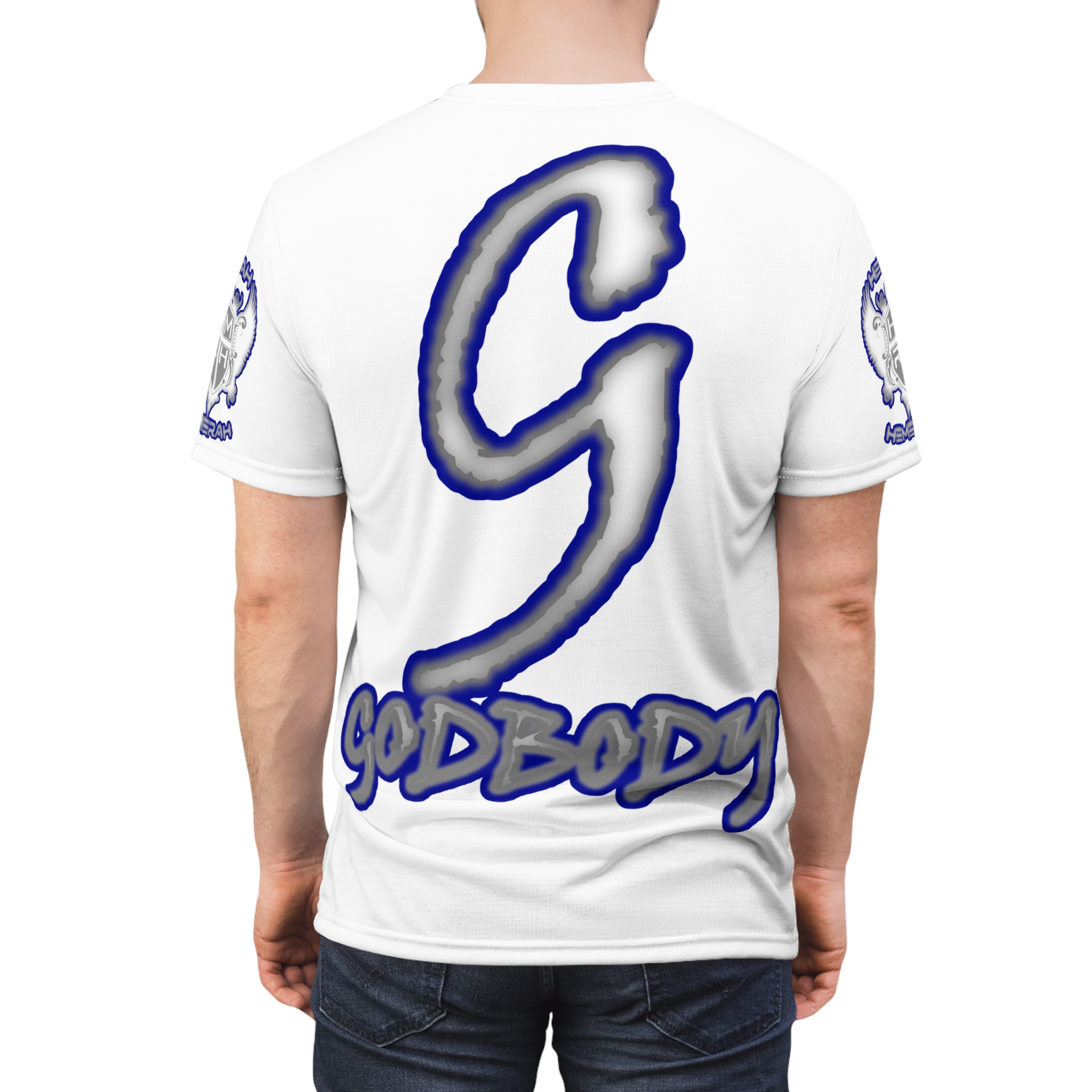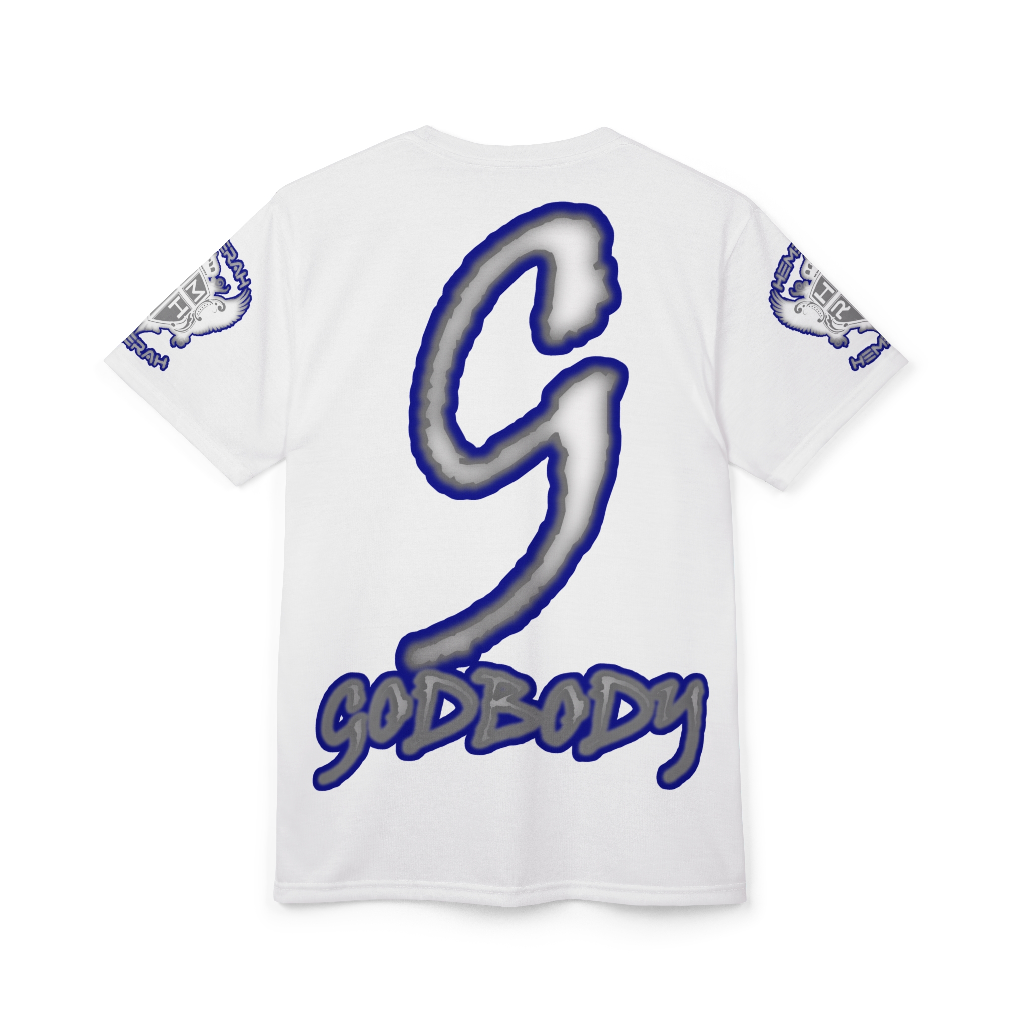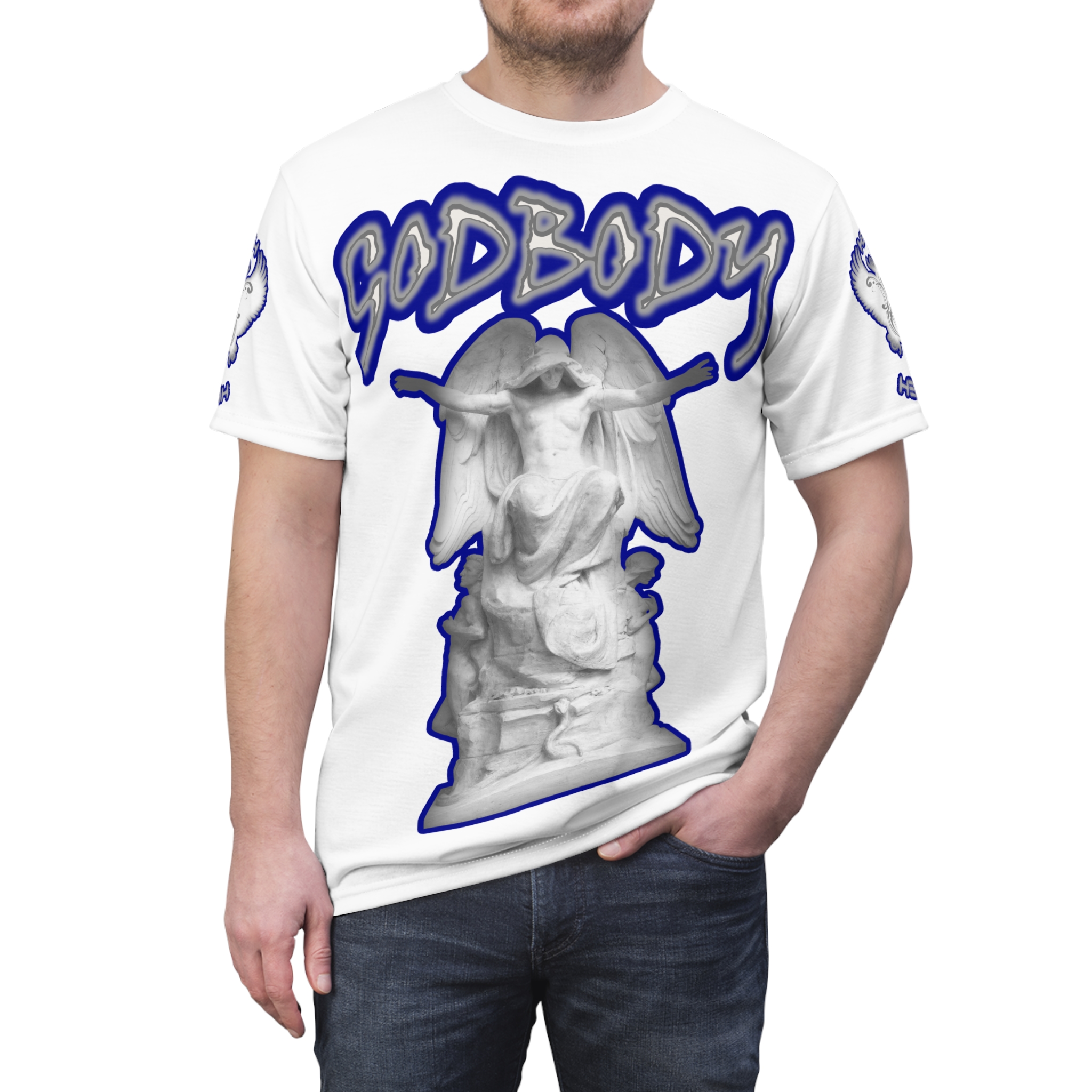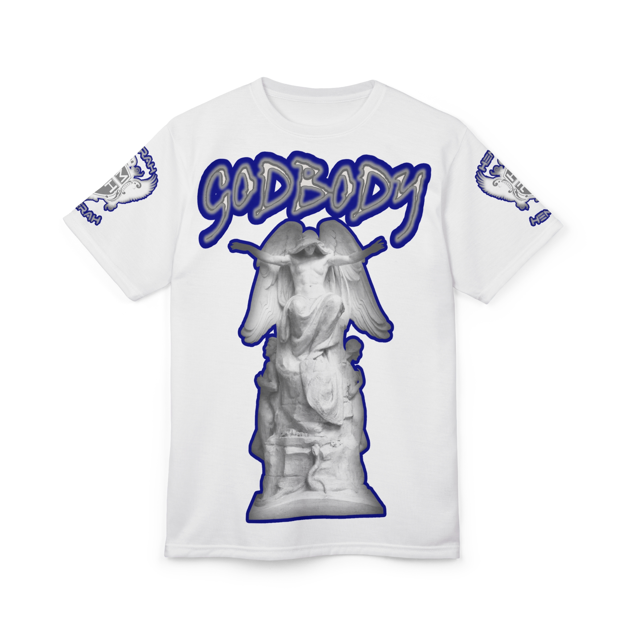 The Hemerah Godbody T-shirt blends bold street energy with classical imagery. A grayscale angel statue stands centered on the chest, its soft marble texture contrasted by electric blue outline and graffiti-style GODB0DY lettering above. The artwork extends subtly onto the sleeves for a cohesive wraparound look. The Hemerah Godbody T-shirt is made of Lightweight polyester which keeps the shirt crisp and breathable while the ribbed collar, shoulder tape, and side seams maintain shape through repeat wear. Wear it layered under an open jacket or solo with jeans to add a striking, urban-art statement to your rotation.