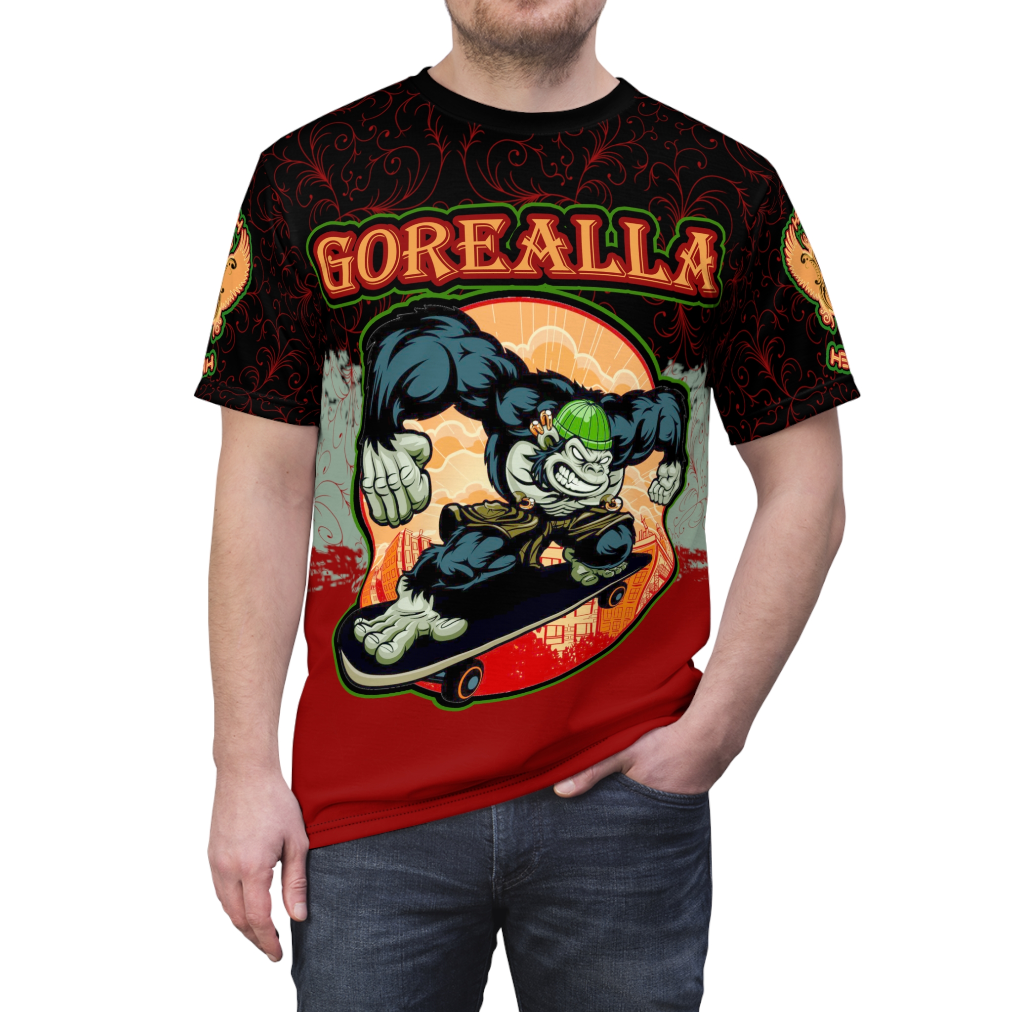The Hemerah Gorealla Gorilla T-Shirt brings raw energy to your everyday wardrobe. A bold gorilla bursts across the front with gritty, hand-drawn lines and a sunset backdrop — colors that stay vivid on the lightweight polyester fabric. Wear it when you want to stand out, ride through the city at dusk, or layer it under a worn denim jacket for shows and late-night hangs. The shirt moves with you: it breathes, dries fast, and keeps its shape so it stays sharp ride after ride. This piece feels lived-in from the first wear, made for people who chase thrills and collect stories in asphalt and spray paint.