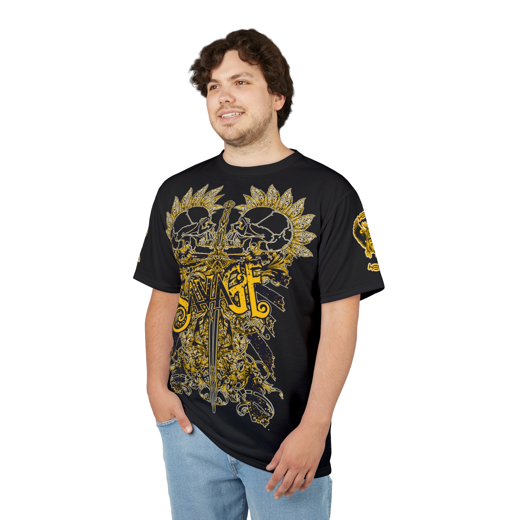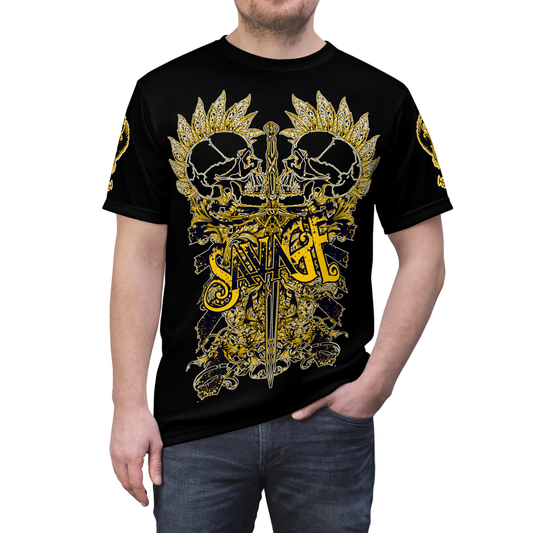 The Hemerah Savage Is Greatness Skull Gothic Black & Gold T-Shirt brings bold, gritty energy to everyday wear. This t-shirt wraps a distressed sword-and-skull motif in sunburst flourishes across the front and sleeves, settling into a deep, lived-in black that reads like a favorite band’s tour shirt. The Hemerah Savage Is Greatness Skull Gothic Black & Gold T-Shirt is Lightweight and quick-drying, the fabric keeps shapes crisp while the ribbed collar and shoulder tape hold structure through repeated wear. It sits as regular-fit layering or a statement piece on its own—reach for it when you want an edge at shows, late-night rides, or when the city feels a little too tame. The shirt ages with you, keeping its attitude and comfort in equal measure.